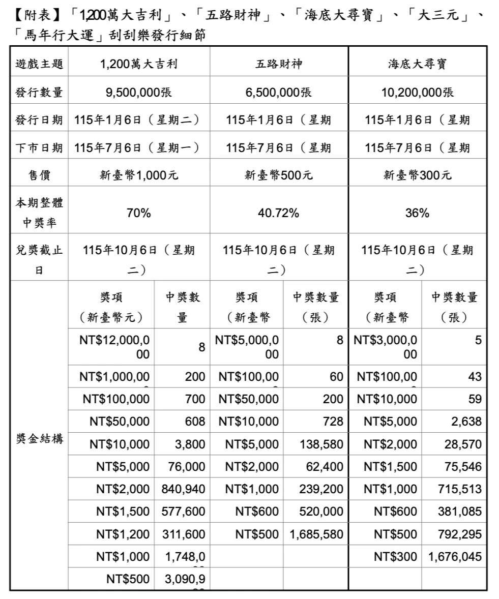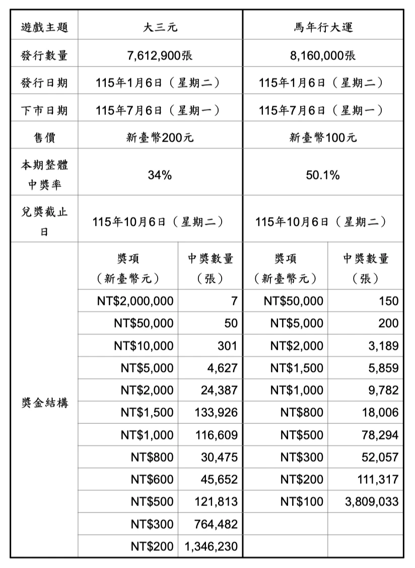 台彩新品刮刮樂總獎金128億元 新年限定款8個頭獎1200萬元