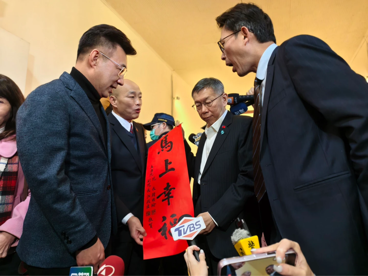 而韓國瑜也在一見面後,率先送上馬年「馬上幸福」春聯,接著雙方才一同進入一旁的接待室,展開閉門會談。