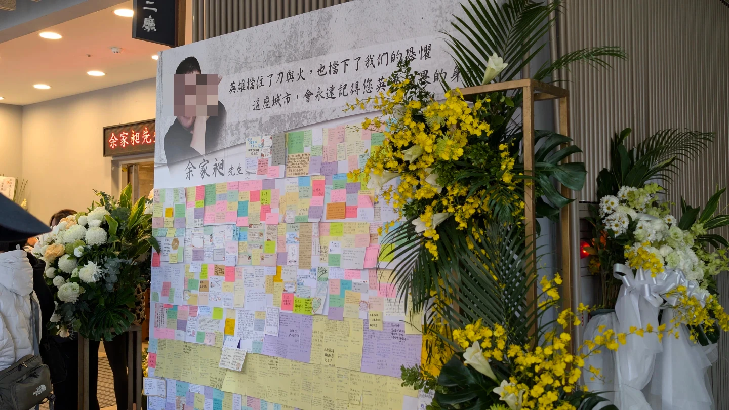 告別式現場兩側牆面貼滿民眾在北捷悼念牆寫下的留言貼,家人選用余家昶生前溫暖陽光照片作為遺照;靈堂內,肅穆的哀樂與低沈的誦經聲交織,空氣中凝結著一股濃濃的不捨與悲慟。