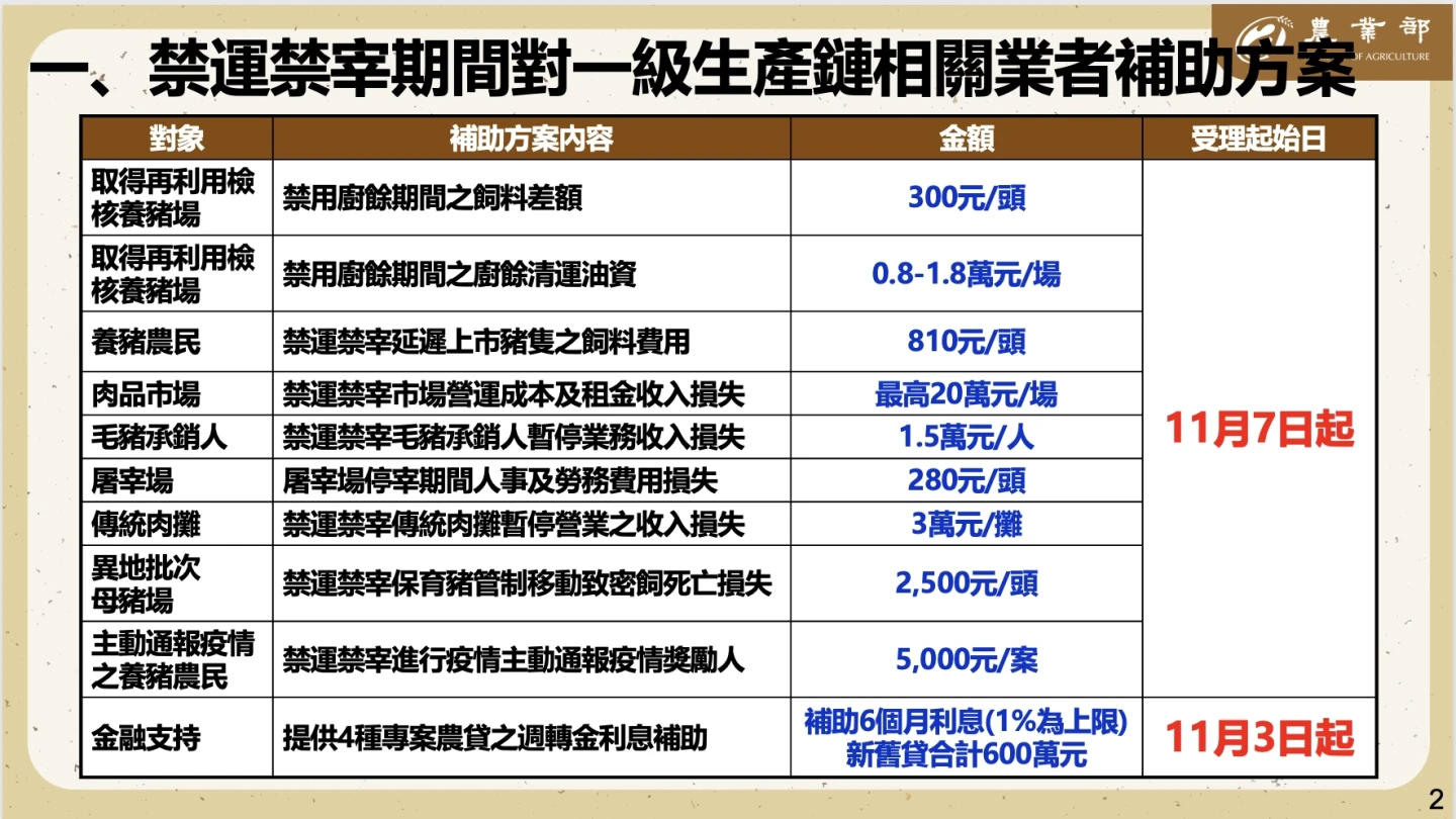 農業部說明,為協助產業平穩復原,禁運禁宰期間提出一級生產鏈相關業者補助方案;解禁後,啟動毛豬產銷調節方案。另,農業部整合經濟部、環境部等相關資源,提供包括飼料差額補助、清運油資補助、營運損失補貼及專案農貸利息補貼等多項協助措施,減低一級生產鏈從業人員如養豬農民、傳統肉攤、毛豬承銷人及肉品市場損失。