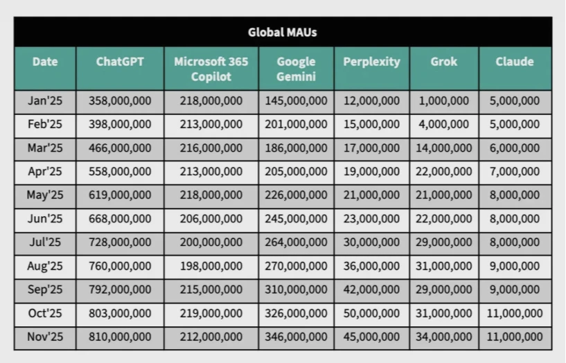 相較之下,ChatGPT正面臨明顯的成長瓶頸。數據指出,從2025年8月到11月,ChatGPT 的全球月活躍用戶僅成長約6%,總數維持在8.1億左右,且在過去4個月中,其全球月活躍市佔下滑3個百分點。