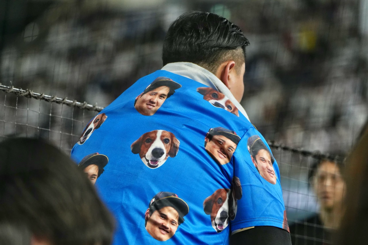 球迷披著印有大谷翔平與其愛犬的毛巾看球。特派記者林林/東京攝影