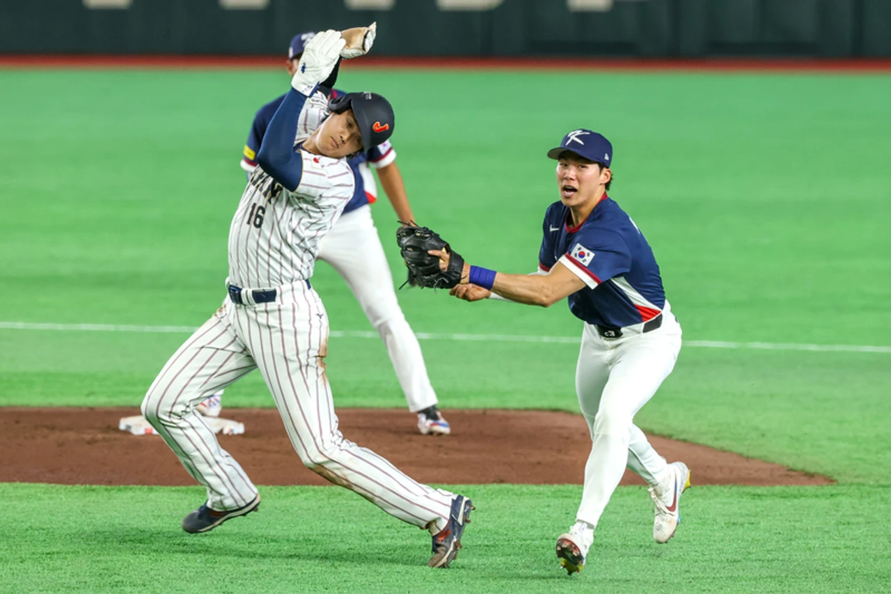 20260310-2026WBC經典賽圖輯,大谷翔平躲避金慧成的觸殺,像是在玩鬼抓人。中央社