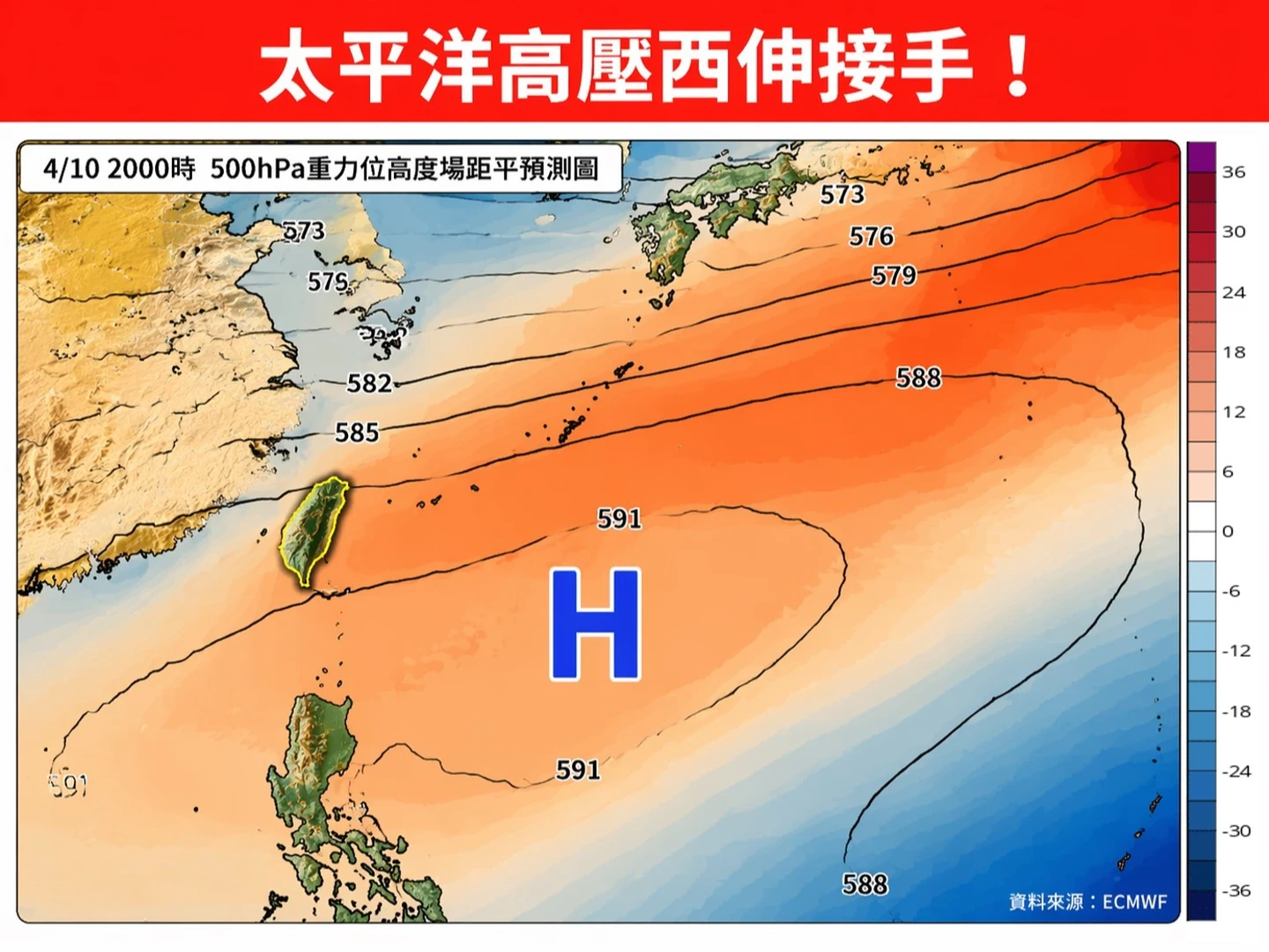 「太平洋高壓西伸接手!」台灣大學大氣科學博士林得恩經營的氣象粉專「林老師氣象站」指出,今起因東北季風減弱,太平洋高壓開始西伸,台灣受到高壓迴流的影響,天氣回穩,氣溫逐日回升,預估北部及宜花地區高溫為24至27°C,其它地區高溫為27至30°C。