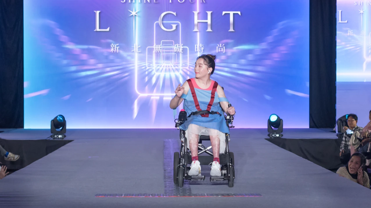 新北市首屆《2025新北無礙時尚 SHINE YOUR LIGHT》今天邀請30位身障者與導盲犬,齊聚新北市政府大禮堂,登場年齡從2歲到78歲都有。5歲的罹患腦性麻痺的簡于涵,拄著前臂拐輔具緩緩登場,感動全場;而曾夢想成為模特兒的林佩璇,因八仙塵爆意外終身需使用輪椅,今天圓夢站上伸展台開心直呼「謝謝讓我有這樣的機會,真的好開心。」