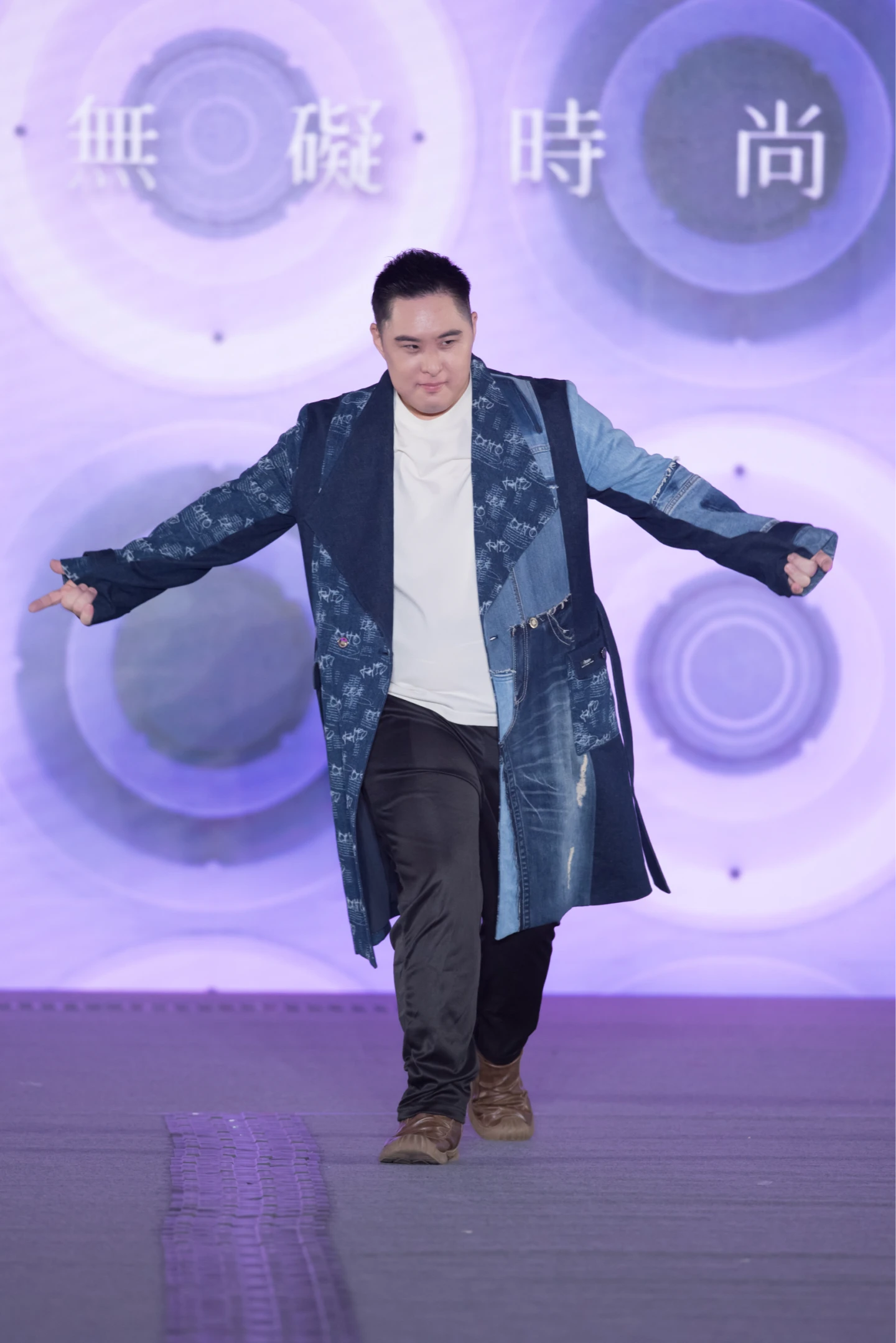 唐氏症青年陳信恒自小為重度心智障礙者,在父親陪伴下投入公益社團,走上伸展台時神情自信、步伐穩定,他父親感性地說「這是他發揮才華的舞台。」