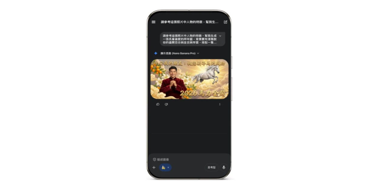 客製化創意長輩圖:不想再轉發千篇一律的罐頭圖?利用Gemini的 Nano Banana Pro)打造一張讓親友群組瘋傳的拜年圖。你可以這樣用