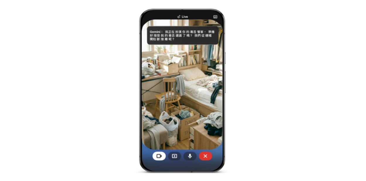 大掃除斷捨離判官:對雜物猶豫不決,或不知道該怎麼收納?利用Gemini Live即時陪你雜物大清理。你可以這樣用Gemini:進入Gemini App,輕觸畫面右下底部的「Live」圖示,並開啟相機掃視房間環境,並說:「依照物品實用性與房間空間,給我犀利的留或丟建議,終結我的選擇困難症。」