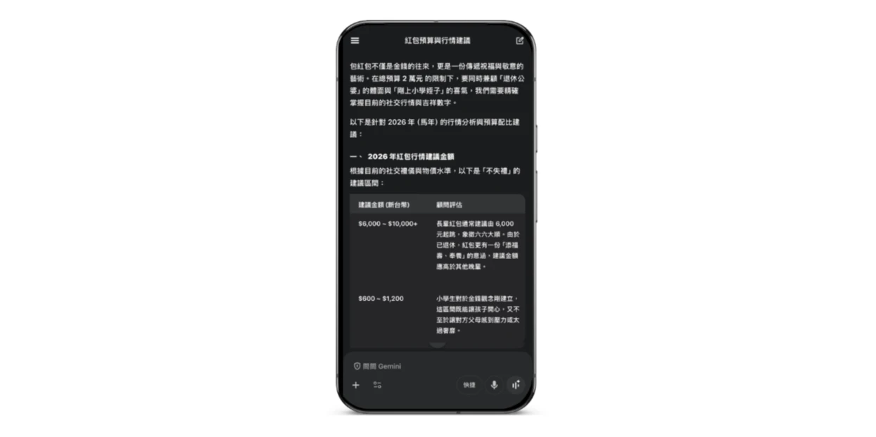 紅包社交小撇步:忘記去年包多少,或怕金額不合時宜?Gemini根據台灣目前的社交行情提供專業建議。可以和Gemini 說:「我要包紅包給剛上小學的姪子和退休的公婆,請根據目前的社交行情提供不失禮的建議金額,並幫我規劃一個總額台幣2萬的紅包配比。」