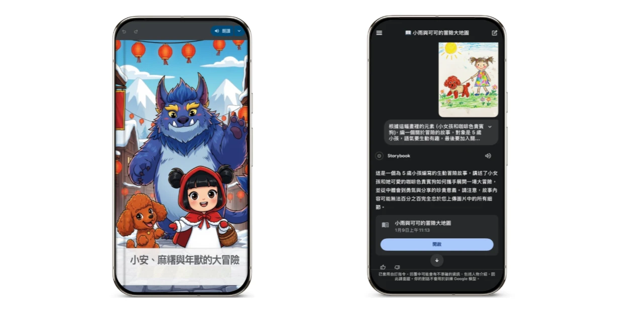 小孩塗鴉變身Gemini Storybook:最有溫度的兒童互動繪本:當親戚小孩吵著要看手機時,這招能讓他們瞬間化身繪本主角。透過 Gemini Storybook 功能,你可以將小孩隨手的塗鴉變成充滿啟發性的連環故事書。你可以這樣用 Gemini:拍下小孩的塗鴉傳進入到 Gemini 輕按頂部的「選單」圖示 ,在「Gem」下,輕按 [Storybook],並說:「根據這幅畫裡的元素,編一個關於年獸冒險的故事,對象是5歲小孩,語氣要生動有趣,最後要加入關於勇氣與分享的寓意。」