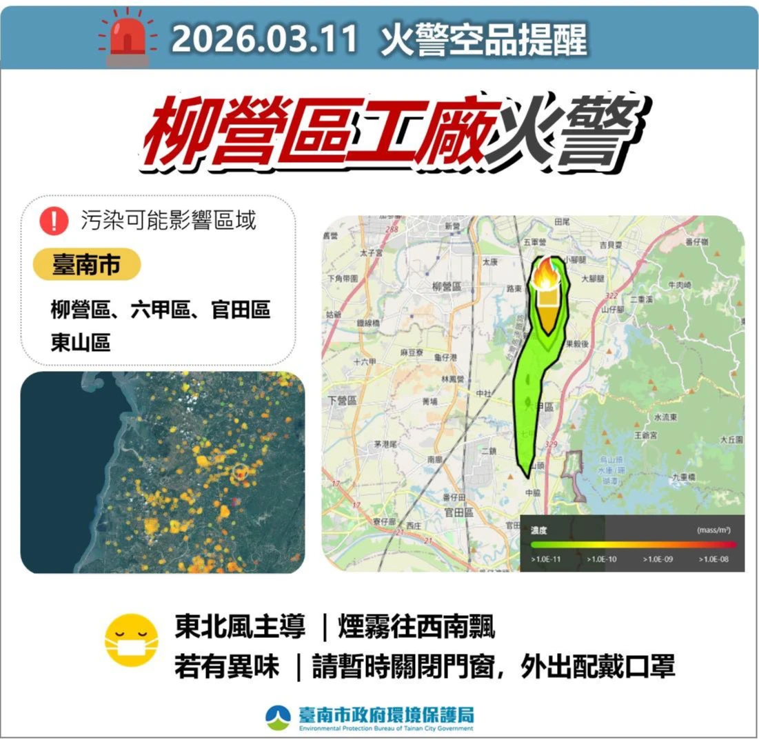 台南市環保局同步發布空品提醒,風向為東北風,煙霧受影響範圍包括柳營區、六甲區、官田區、東山區,提醒4個地區民眾,應盡量留在室內,若需外出務必佩戴口罩,家中門窗也請緊閉,以避免吸入有害顆粒物。