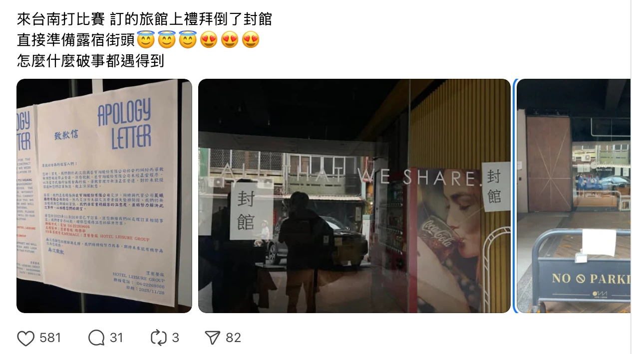 台南市觀旅局表示,經了解該旅館是因前後任經營者權利移轉問題,產生民事糾紛才導致暫時停業。市府已督促業者必須妥善安排受影響旅客轉宿或全額退費。民眾若遇類似消費爭議,可直接聯繫業者處理窗口,或撥打市府1999專線,由市府介入協助爭取權益。