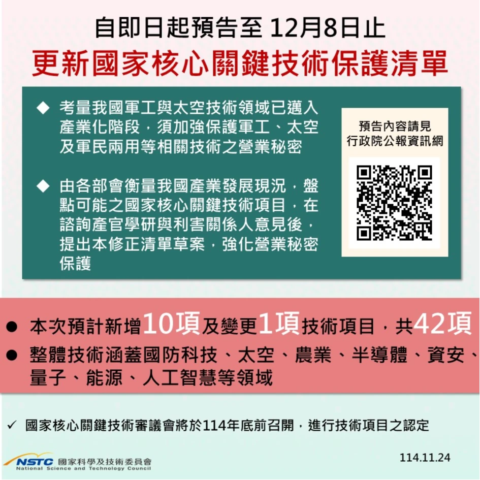 【記者賴昀岫/台北報導】國科會今(24日)預告修正「國家核心關鍵技術項目及其主管機關」,本次修正考量我國軍工與太空技術領域已邁入產業化階段,須加強保護軍工、太空及軍民兩用等相關技術之營業秘密,預計新增10項及變更1項技術項目,整體技術領域分為國防科技、太空、農業、半導體、資安、量子、能源、人工智慧等,今起預告14天至12月8日止。