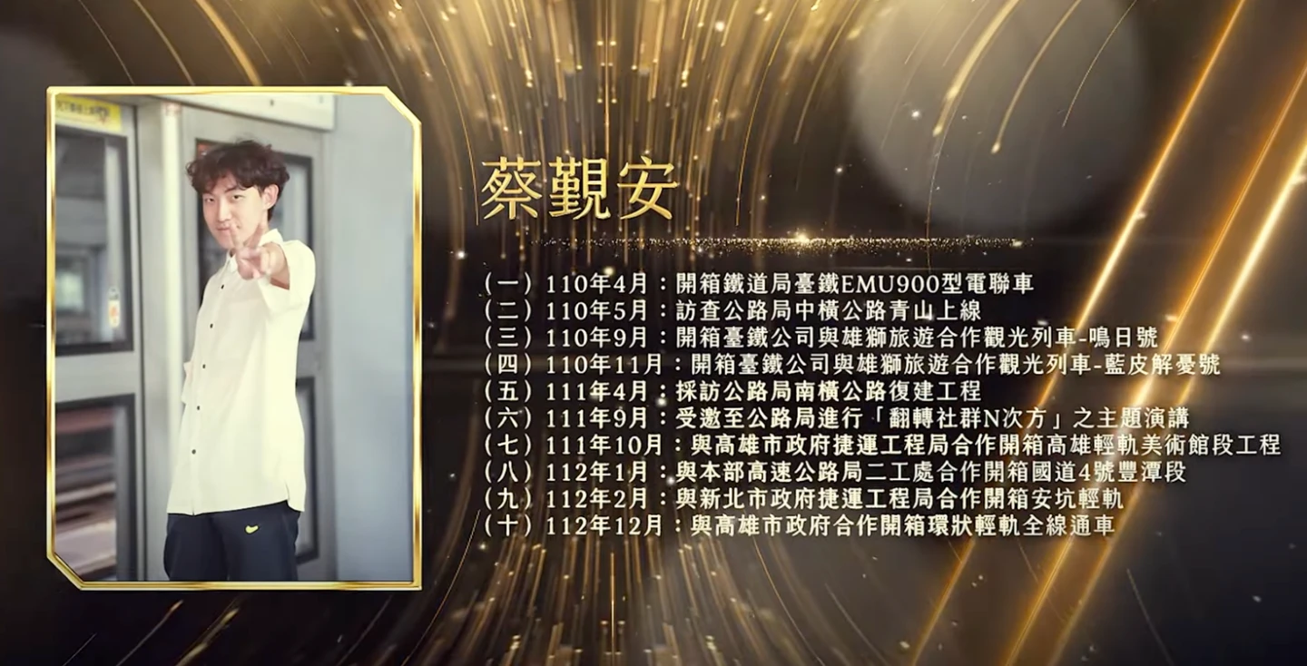 另「特殊貢獻獎」將頒發予Youtuber蔡黑皮(蔡覲安)先生,感謝他拍攝YT影片,以輕鬆、淺顯易懂的方式,介紹政府重大交通建設,拉近公部門與民眾的距離,亦開啟交通建設黑暗期各方互相體諒的契機。