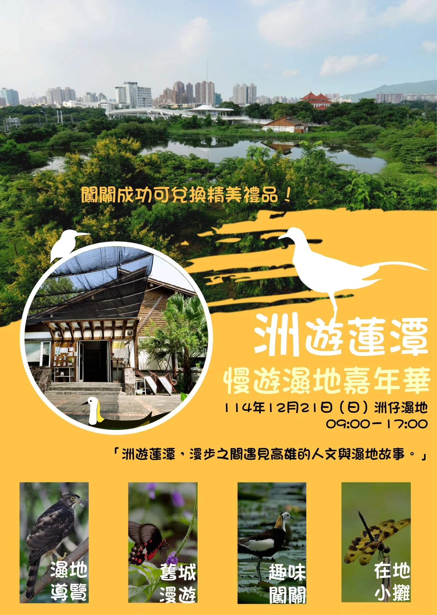 【記者王勇超/高雄報導】高雄左營的洲仔濕地將在12月21日化身城市中的生態綠洲。高雄市政府工務局公園處攜手台灣濕地保護聯盟,於當日舉辦「洲遊蓮潭.慢遊濕地嘉年華」,以「慢遊濕地」為主軸,透過走讀、生態導覽、環境教育與互動活動,引領民眾走進都市裡少見的自然棲地,體驗濕地與舊城文化交織的豐富風貌。