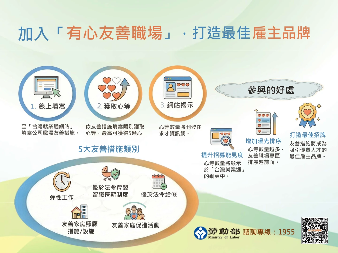 【記者王良博/台北報導】勞動部今(11)日宣布於「台灣就業通」網站,推出企業友善職場資訊揭示,企業若有彈性工作、優於法令給假、優於法令友善懷孕措施及育嬰留職停薪制度等5大項目,可自行上網填寫,每填一個項目就可獲得1顆「心」,越多心的企業,招募資訊排序會越靠前,有助企業徵才。