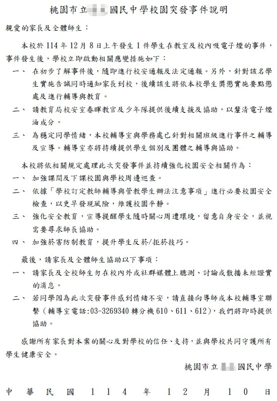 校方今天臉書粉專說明該事件,114年12月8日上午1名學生「在教室及校內吸電子煙的事件」儘管教育局已表示,「初判煙油內依托咪酯呈陽性反應」,仍稱該學生吸「電子煙」。