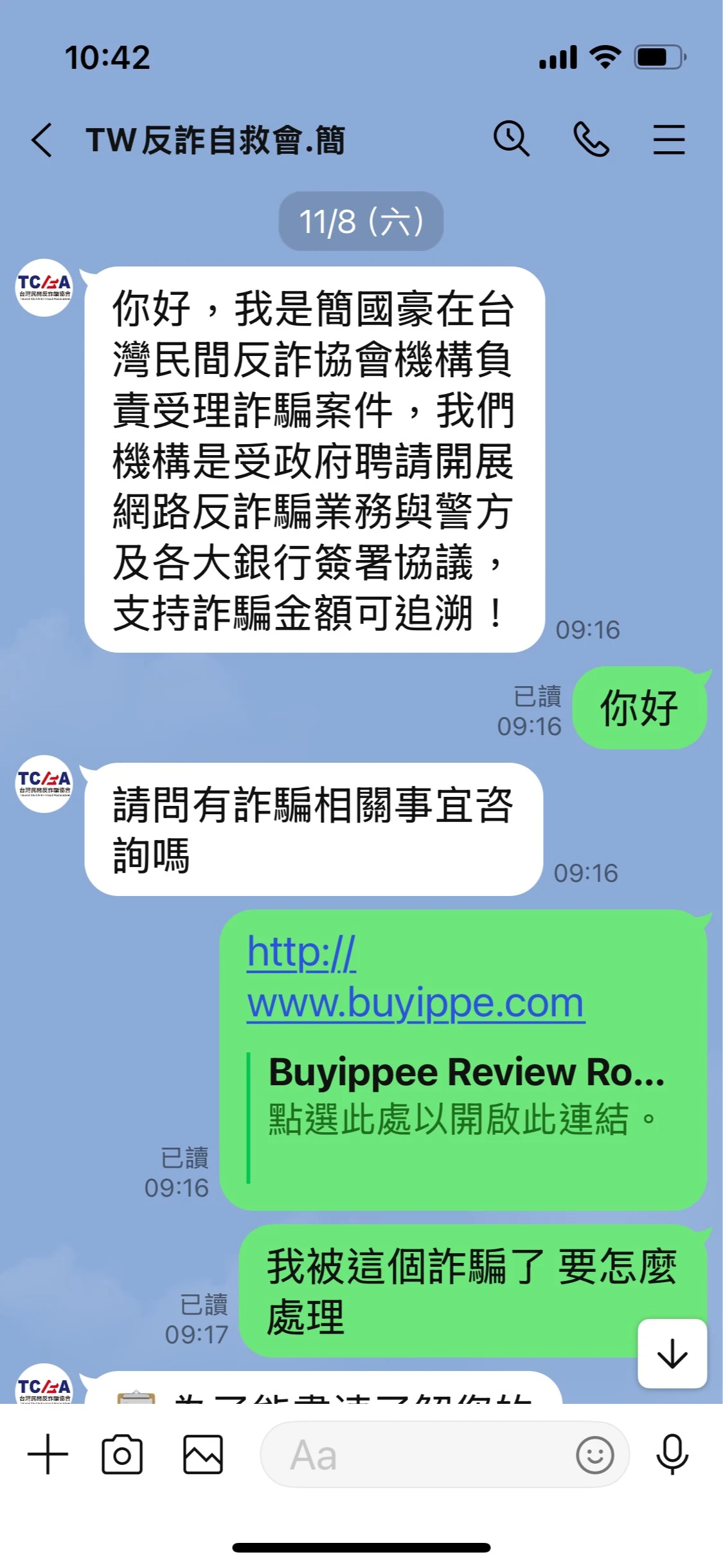一名民眾表示,自己先前因網路投資詐騙損失近百萬元,誤信該名冒充協會人員的詐騙集團成員能協助追回金錢,依其指示先匯出所謂的「前期技術費用」新台幣八萬元,並簽署「資金追回委託書」。詐騙成員後續回覆「款項已追回」,卻又以「帳號問題」為由無法入帳,該民眾驚覺異常,遂報警並向協會查證,確認自己再度受騙。