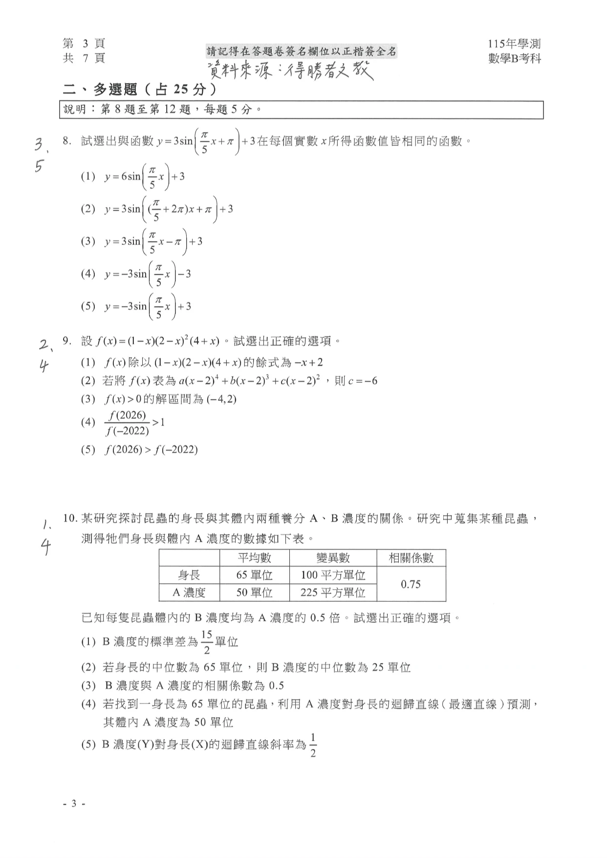 得勝者文教預估,學測數B頂標11級分、前標9級分、均標6級分、後標4級分、底標3級分。