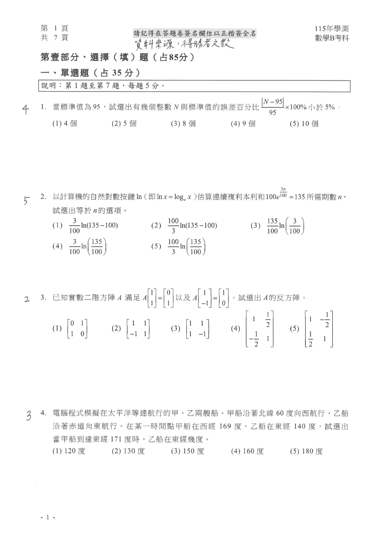 【記者王良博/台北報導】115學年度學測1/17到1/19舉行,今(19)日上午數學B已考完。高中老師分析,數B試題難度升級,讀不懂題目就無法下筆,試題中有領海基線轉化為平行線距離、經緯線對應數學概念等考法,也有數B特有圓錐截痕、單點透視法概念入題,另外有題目提到公益彩券及福袋,結合即將到來的春節氛圍。