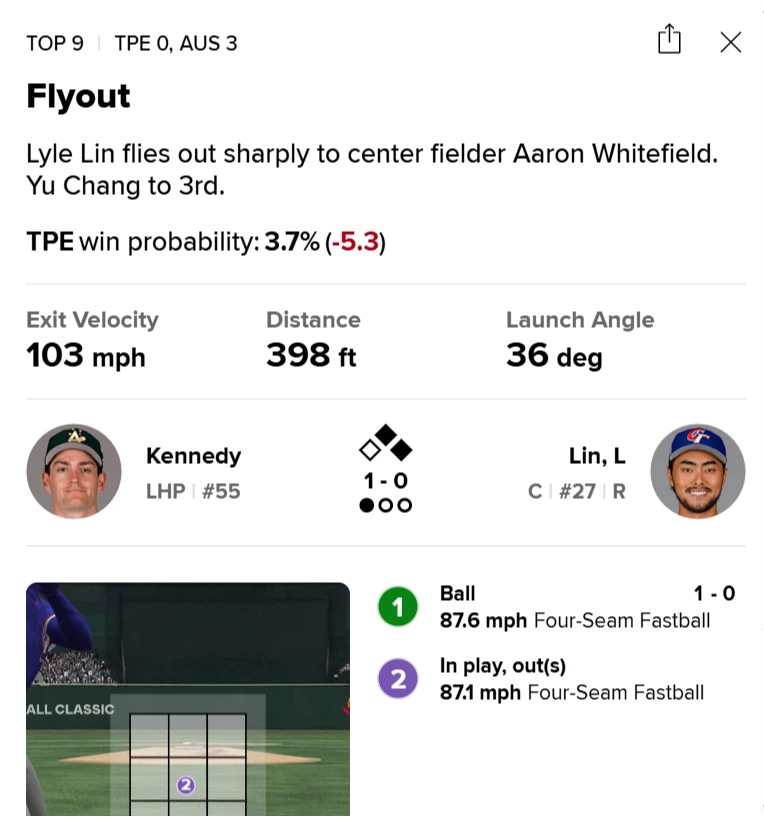 根據WBC官網顯示,林家正這記飛球,飛行距離足足有398英尺,比澳洲隊的2發全壘打飛得都還要遠,澳洲隊的2發全壘打飛行距離分別為388英尺和383英尺,只能說林家正這記飛球飛行的方向不對,要是林家正打向右外野或左外野都很有可能成為全壘打,戰局也將因此翻轉。