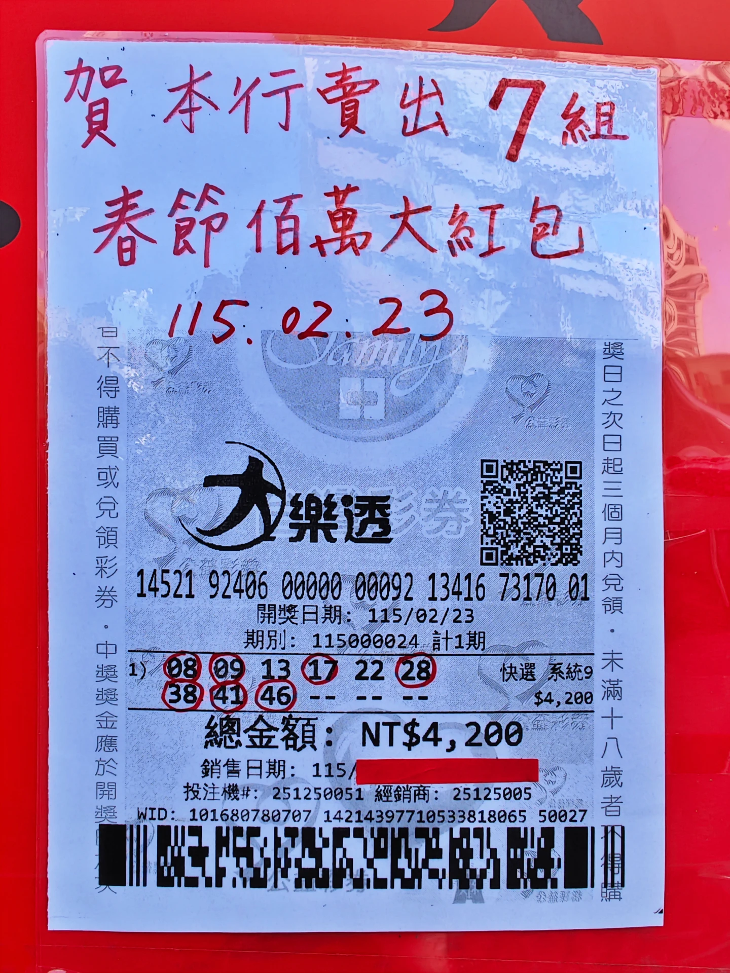 當晚加碼獎號開出,男子得知手上的彩券對中「08、09、17、28、38、41、46」等7個號碼,興奮地帶著彩券跑回店裡,經店家確認一人獨得7組百萬大紅包,抱走700萬元,男子興奮對店員笑說:「拜完觀音佛祖就中獎,真的太靈驗了!」