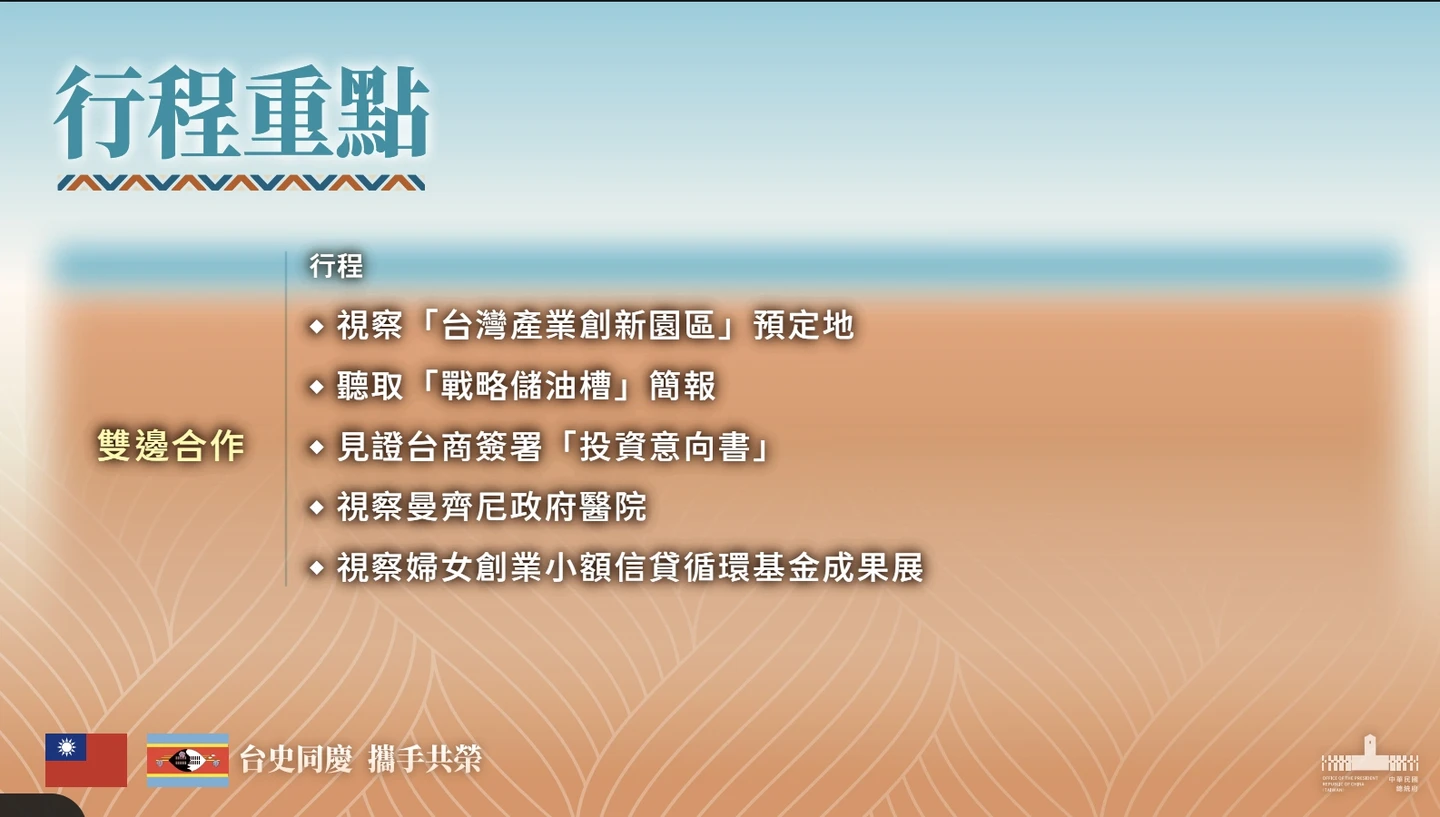 吳志中介紹,此次行程有3個主軸,其一為官式行程,包括會晤史王恩史瓦帝三世(H.M. King Mswati III),舉行雙邊會談;兩國元首簽署聯合公報;兩國元首見證兩國外長簽署《關務互助協定》;及拜會王母。