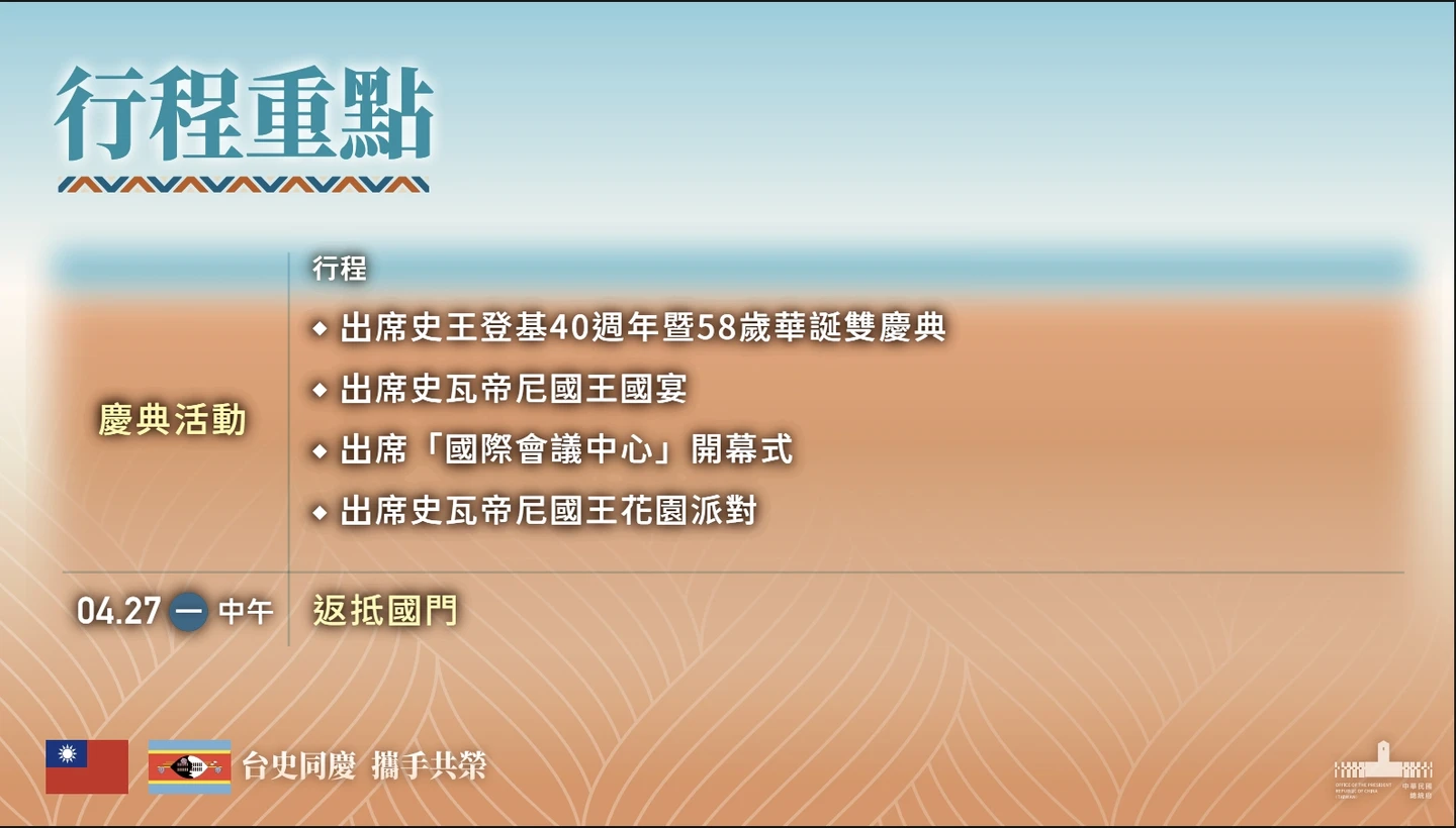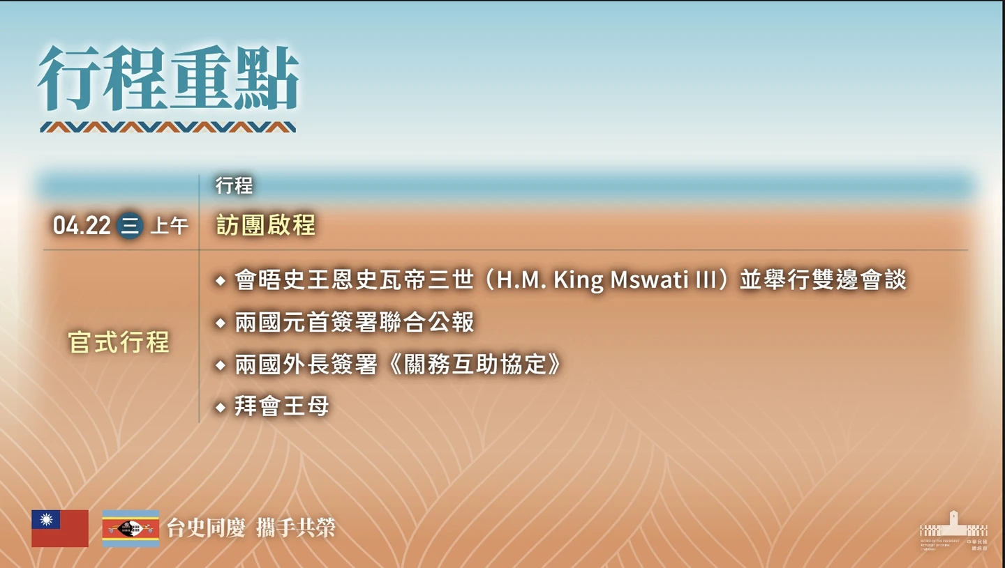 郭雅慧表示,史瓦帝尼為慶祝史王登基40週年、史王58歲華誕慶典,預計在4月24到26號舉行系列慶祝活動。史王2024年曾應邀到台灣,來參加賴總統就職大典,今年他親簽信函誠摯邀請賴總統在史國重要時刻出席相關慶典,為積極正面回應史王的熱情邀約,也展現對邦交國的重視,希望為雙邊合作在既有堅實基礎上注入新的動力,賴總統決定在4月22號到4月26號率團訪問史瓦帝尼。