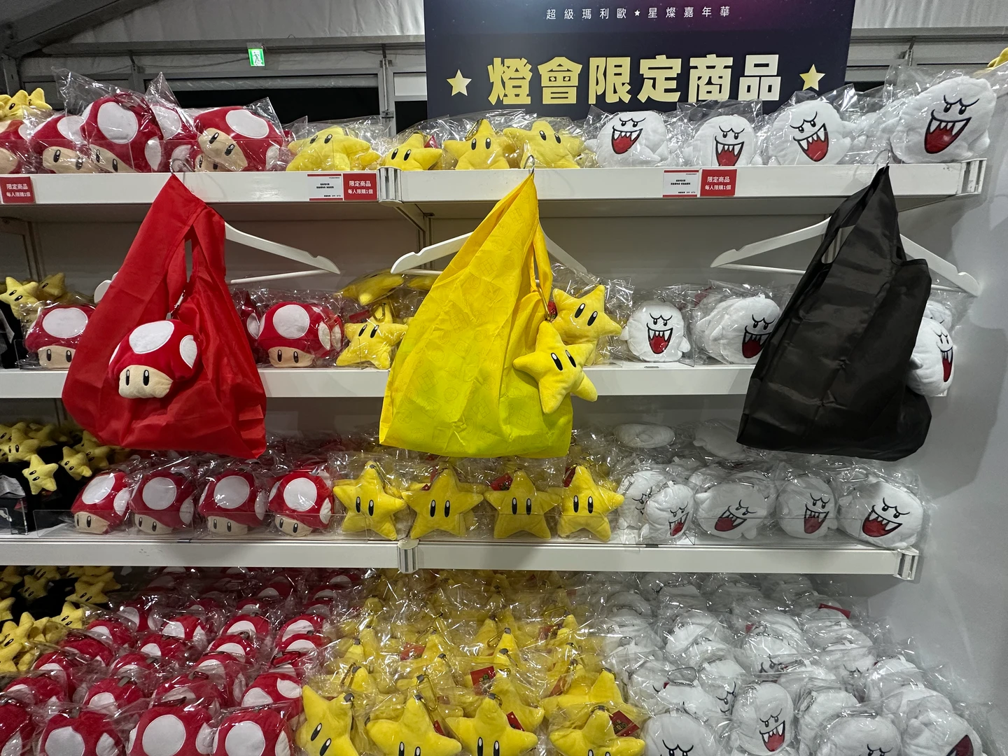 超級瑪利歐星燦嘉年華,共計9件作品,以《超級瑪利歐》系列角色與經典元素為設計主題,結合燈光展示、角色造型與互動設計,規劃適合親子與各年齡層共同參與的主題燈區,現場設有賣店,提供燈會限定商品,如摺疊購物袋-無敵星款、超級蘑菇款、害羞幽靈款各399元,還有超級瑪利歐無敵星托特包299元,超級瑪利歐無敵發光髮箍399元,每款每人限購1個。