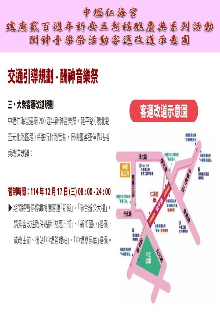中壢仁海宮敬祝建廟200年祈安五朝福醮,普渡盛典,今晚7時將進行「酬神音樂祭」,結合傳統廟會文化與現代流行音樂演出,由舞台震撼團隊「震樂堂」開場演出本土宮廟搖滾樂,並邀請藝人賴銘偉、賴慧如、郭婷筠等人卡司,今天上午8時起進行交通管制,管制封閉路段為中壢仁海宮前延平路(自環北路口起至元化路口止)。