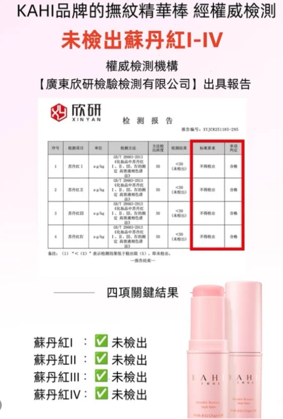 KAHI官方發出聲明表示,已委託權威檢測機構進行重新檢驗,結果顯示,KAHI精華撫紋棒產品中未檢測出「蘇丹紅I-IV」成分。