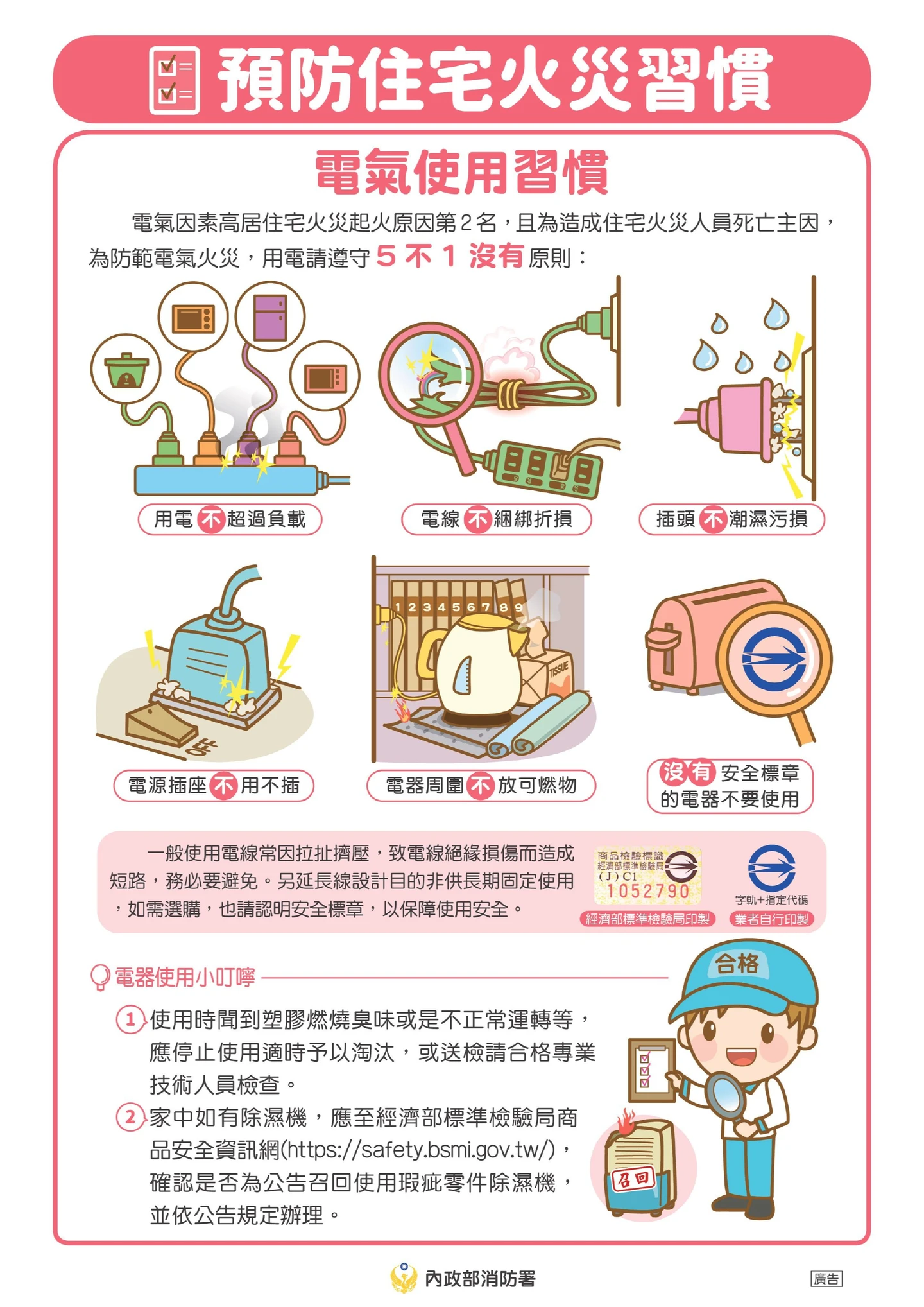 至於平時應做好哪些防火安全措施?消防署提醒,在電氣使用上,民眾應牢記「5不1沒有」原則,包括用電不超過負載、電線不綑綁折損、插頭不潮濕污損、電源插座不長插、電器周圍不放可燃物,以及沒有商品安全標章的電器不用。