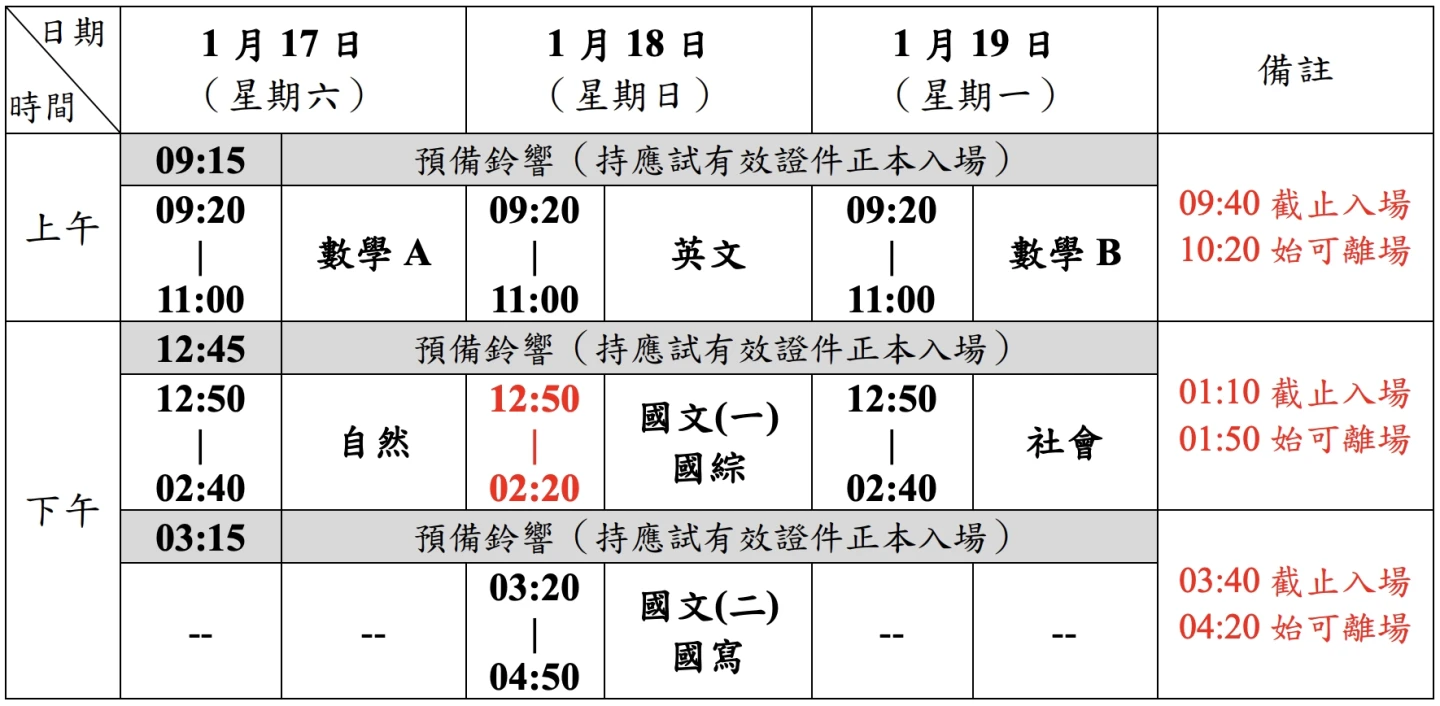 1/17學測首日考數學A、自然,1/18考英文、國文綜合測驗及國文寫作,1/19則考數學B跟社會。