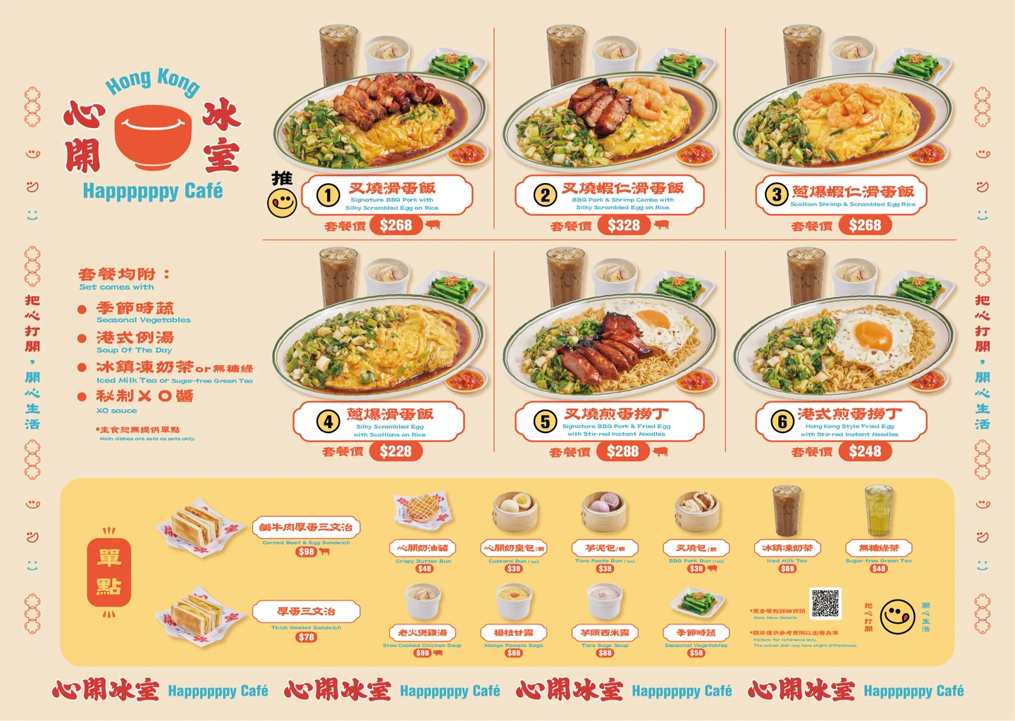 餐點方面,「心開冰室」將港式經典再升級,共推出6款系列套餐最低228元起,首推「心開叉燒滑蛋飯套餐268元」以招牌叉燒結合爆量靈魂蔥油,並鋪在軟嫩滑蛋飯上,視覺與味覺雙重震撼;「叉燒煎蛋撈丁 套餐288元」公仔麵拌入特製撈麵醬汁,搭配煎蛋與銷魂蜜汁叉燒,原地重現正宗港味。套餐均含季節時蔬、港式例湯、冰鎮凍奶茶/無糖綠、秘製XO醬。