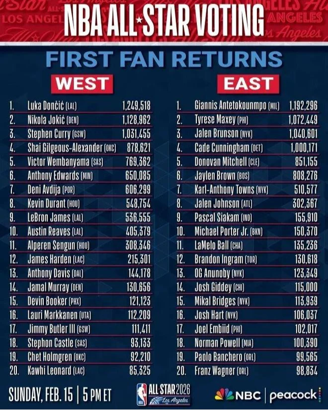 【記者陳雍仁/綜合報導】NBA今(30日)公布明星賽第一階段票選結果,出現「改朝換代」的新局面,湖人新一哥東契奇(Luka Doncic)晉升新人氣王,以124萬9518票強勢領跑全聯盟,「詹皇」詹姆斯(LeBron James)則跌落神壇,人氣暴跌,僅獲53萬6555票,排名西區第9,甚至還輸給拓荒者新星阿夫迪亞(Deni Avdija)近7萬票。