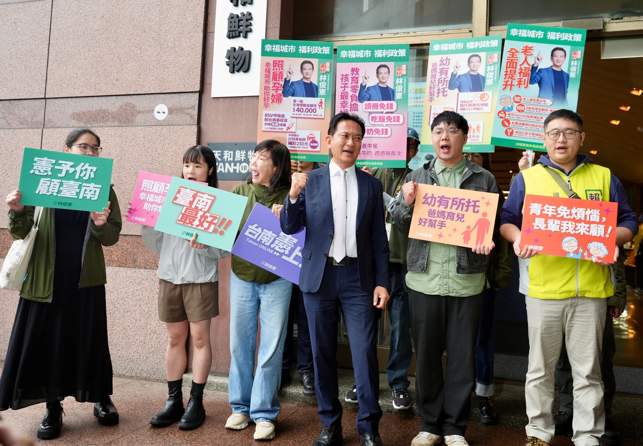 林俊憲今天下午3時30分前往黨中央,登記參加台南市長初選,多位幕僚帶著政見手板到場應援,林說,原本是台南幾位戰友、同事要陪同來登記,包含郭國文、林宜瑾、賴惠員立委,但因為自己臨時改時間,他們已經不在台北,加油團來自他跟戰友們的辦公室國會助理,非常感謝他們。