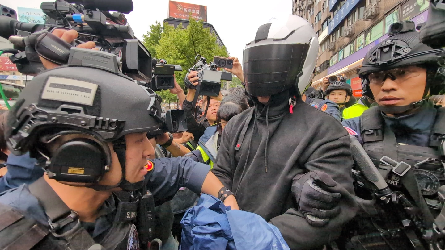林男下午4時許戴著安全帽、雙手上銬遭特勤警力押解帶回警局,面對為什麼犯案等問題,均未發一語。