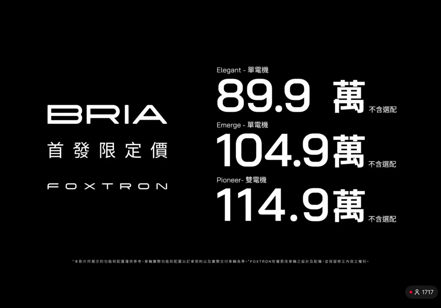 鴻華先進表示,BRIA定價時,我們有兩個主要的考量,第一,價格要忠實的反映自主研發的投入與國際合作的價值,第二,價格必須讓台灣的消費者感受到尊重,本次BRIA共推出三種車型選擇,從入門款後輪驅動Elegant新台幣89.9萬元起,四輪驅動的頂規Pioneer 114.9萬元起,滿足不同消費者需求。