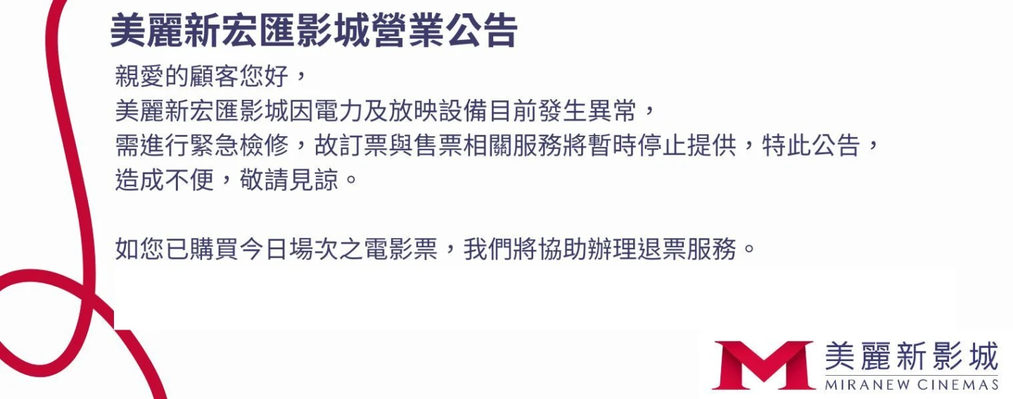 美麗新宏匯影城因為電力與放映設備狀況不斷,本月8日還一度發出「臨時緊急檢修」通告,暫時不提供售票與訂票服務。