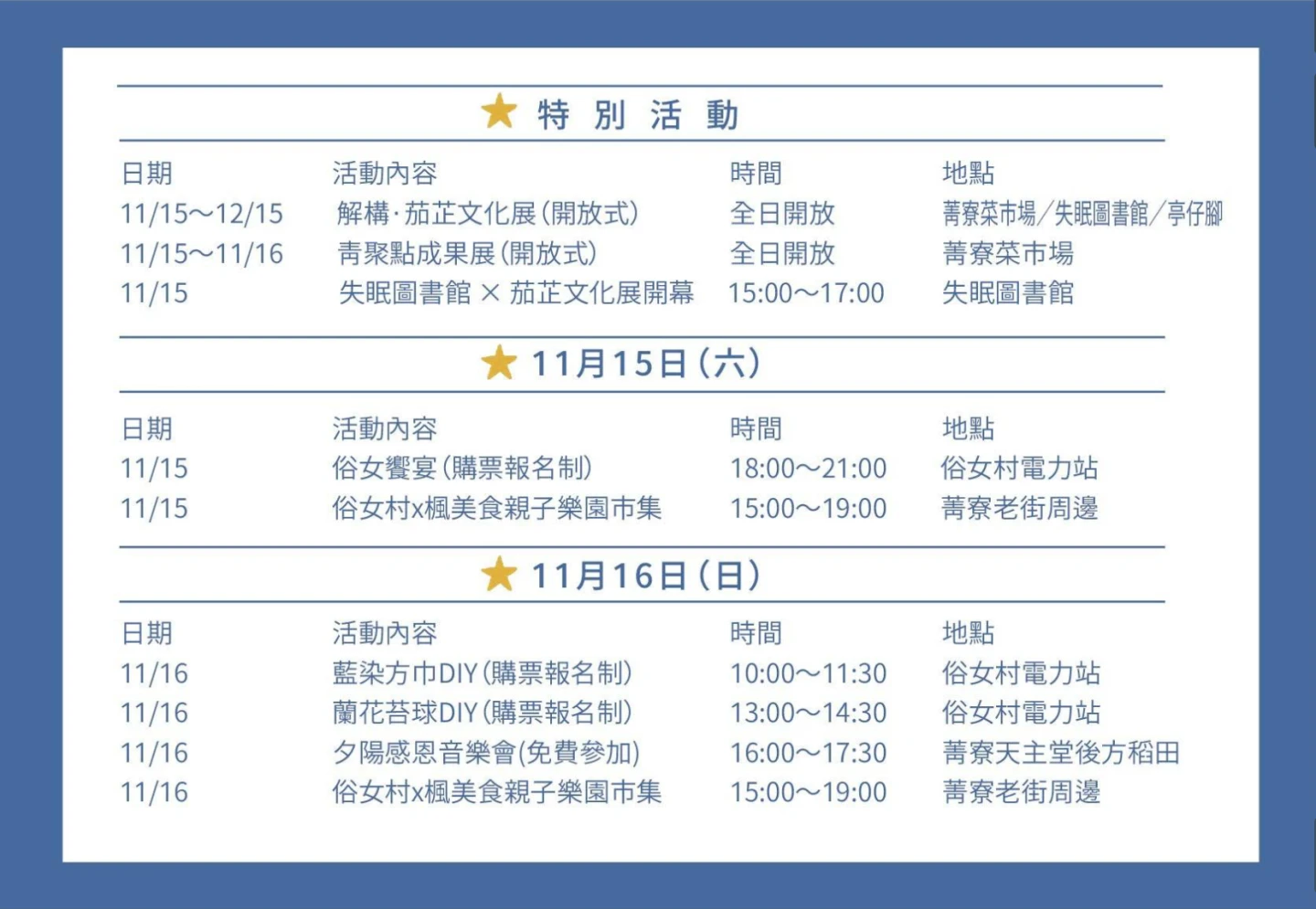 這場秋收慶典由後壁區公所、後壁商圈與後壁俗女村合辦,以「俗女日和」為主題。後壁俗女村長吳翊榛表示,15日將由「解構.茄芷文化展」與「青聚點成果展」揭開序幕,在菁寮市場、失眠圖書館與亭仔腳展出,呈現地方青年與設計者共同打造的文化實驗成果。當晚還有充滿情感與美學的「俗女餐桌饗宴」,結合在地食材與風土故事,在俗女村電力站溫暖開桌。