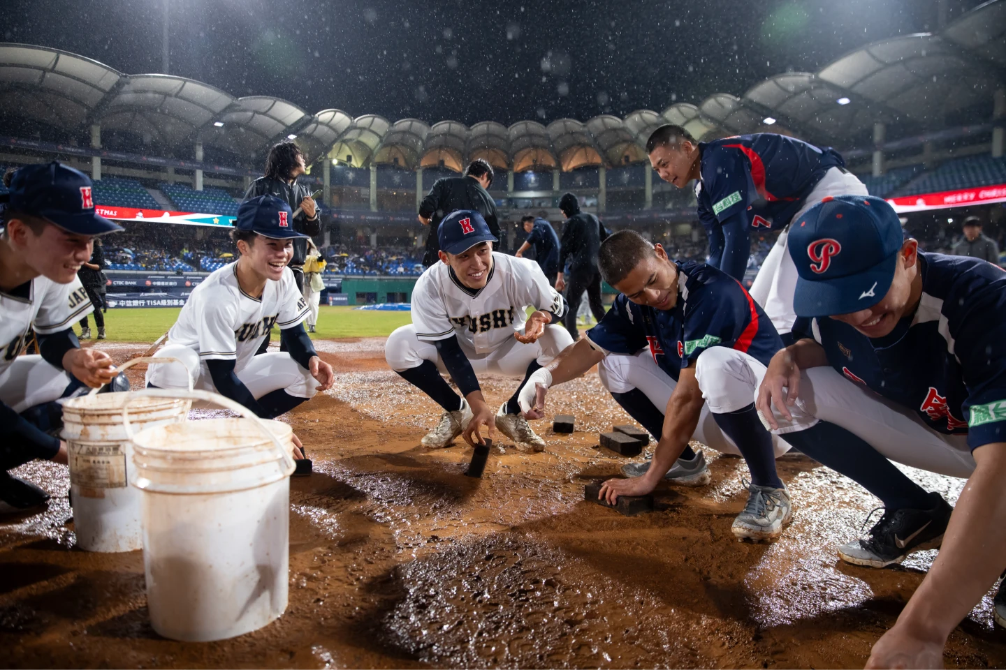 今天受到鋒面影響,新莊棒球場整日都陰雨不斷,傍晚雨勢加大導致內野出現積水情況,原訂要在場上進行的開幕儀式先移到二樓觀眾席,晚間平鎮高中對上九州聯隊的比賽,原定6點30分的比賽延到7點開打,且為了加速場地整理,兩隊球員、教練,就連現職亞洲棒球總會特助的周思齊也跟上。