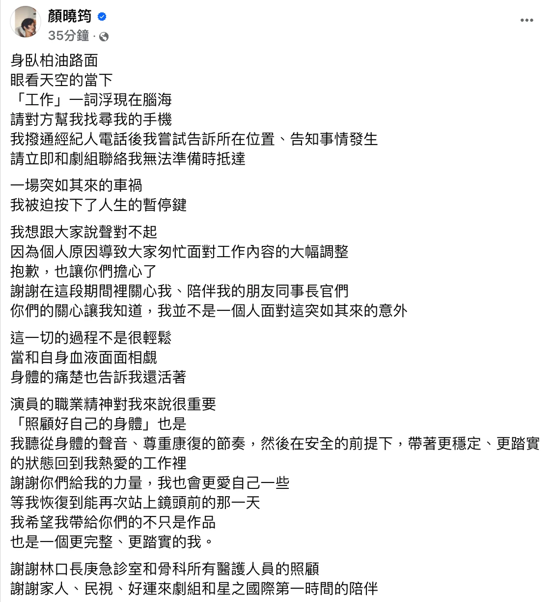 車禍發生後,顏女透過臉書社群寫下429字曝心境,她說,「當身臥柏油路面眼看天空的當下,『工作』一詞浮現在腦海。」她道歉說「一場突如其來的車禍,我被迫按下了人生的暫停鍵,想跟大家說聲對不起」