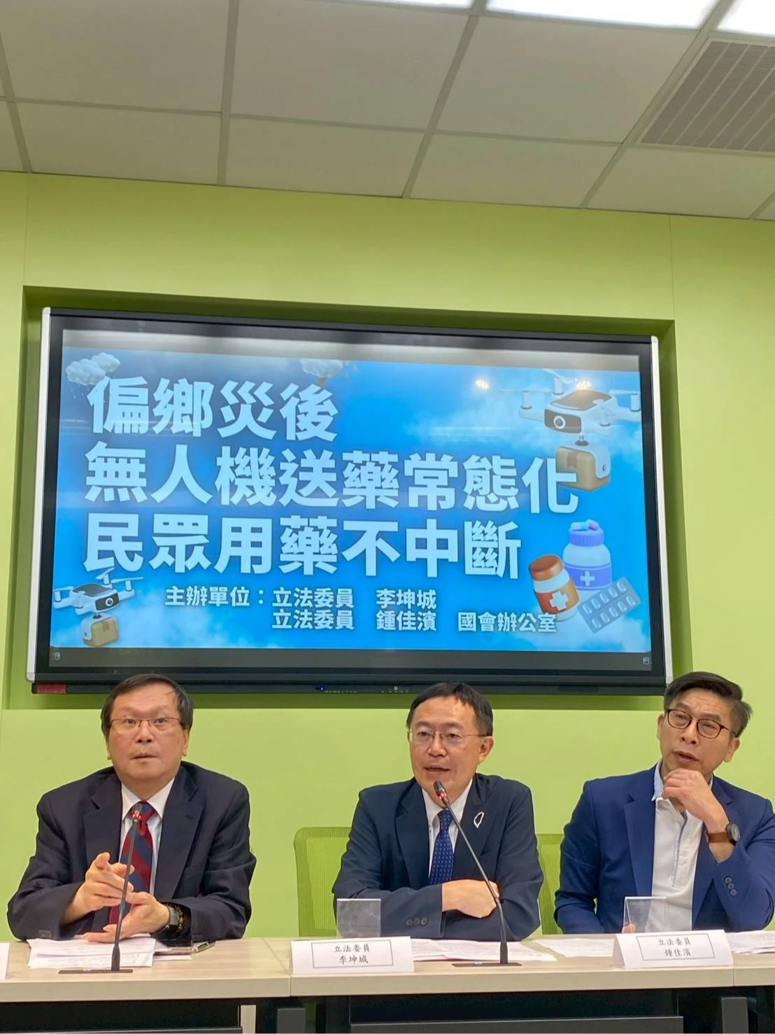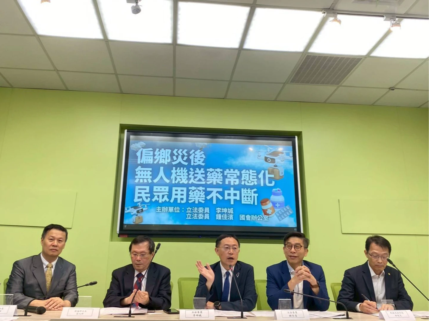 李坤城、鍾佳濱今召開「偏鄉災後無人機送藥常態化 民眾用藥不中斷」記者會,衛福利部次長莊人祥、交通部民航局副局長林俊良、資訊處處長李建璋等人出席。