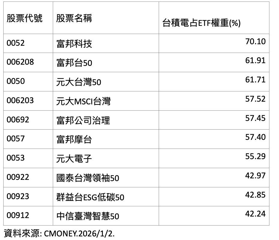根據CMoney統計,截至2026年1月2日,台積電權重最高的ETF依序為富邦科技(0052)、富邦台50(006208)、元大台灣50(0050)、元大MSCI台灣(006203)及富邦公司治理(00692),其中0052台積電占比高達70.1%,成為市場中含積量最高的台股ETF。