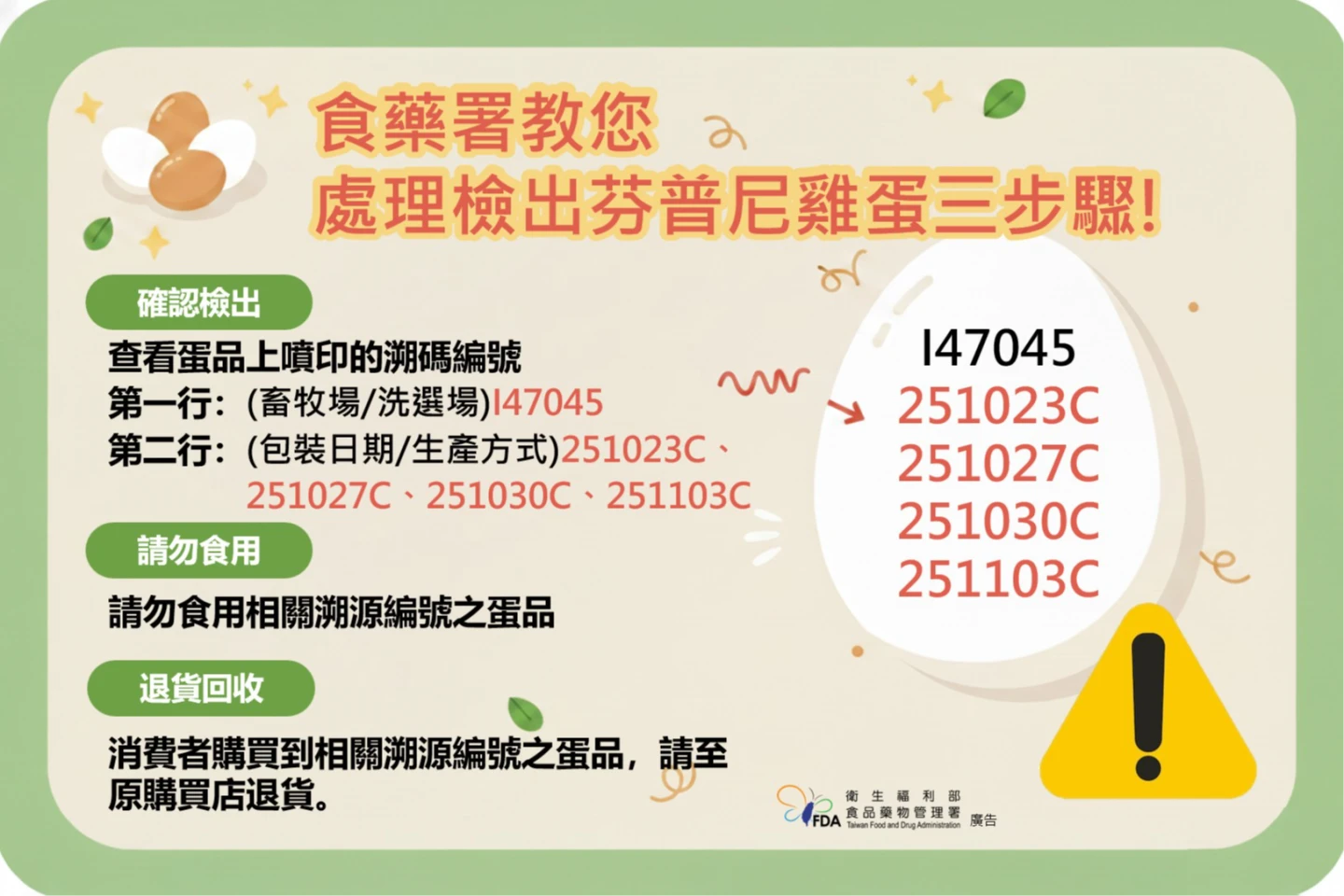 彰化縣衛生局於販售端抽驗雞蛋「鮮健蛋品洗選蛋(白殼雞蛋)」(噴印溯碼編號:I47045-251023C)檢出農藥殘留「芬普尼代謝物(Fipronil-sulfone)」含量0.03 ppm不符合「動物產品中農藥殘留容許量標準」規定(殘留容許量標準:0.01 ppm)。
