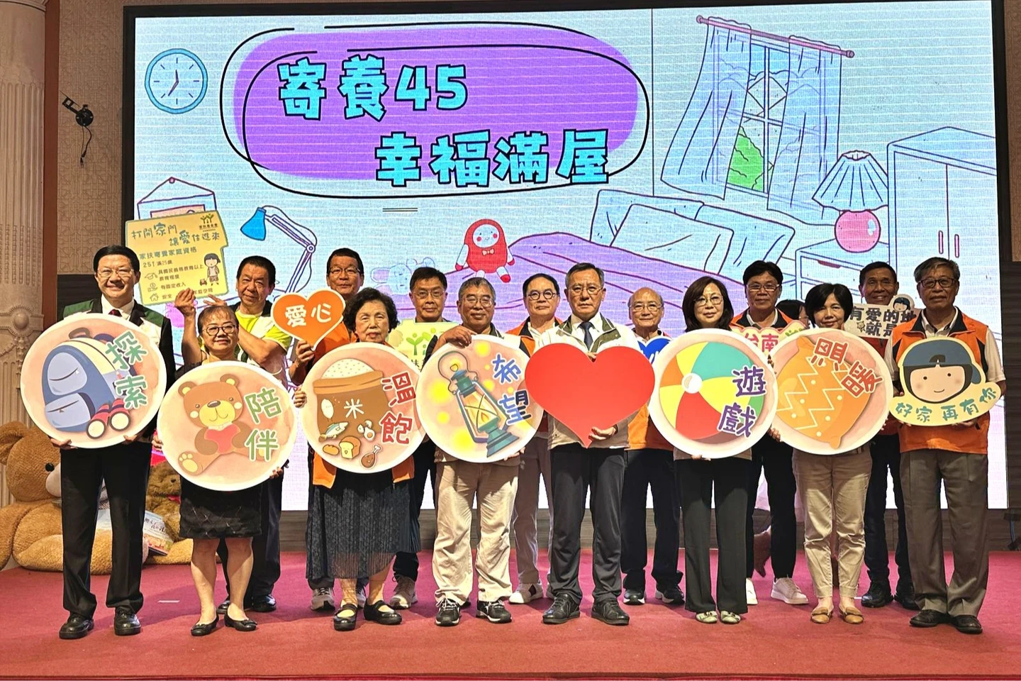 「寄養45‧幸福滿屋」授證活動今天在永康區盛大登場,社會局副局長葉誌明、家防中心主任施清發、少婦福利科科長許乃文、永康區長李皇興與北台南家扶主委呂明憲、南台南家扶主委楊政達、寄養家庭代表,共持象徵「愛」的愛心、「探索」的背包、「希望」的檯燈、「溫飽」的食物、「遊戲」的球、「溫暖」的抱枕、「陪伴」的小熊,代表讓孩子透過寄養服務「讓家,不再是想像」。