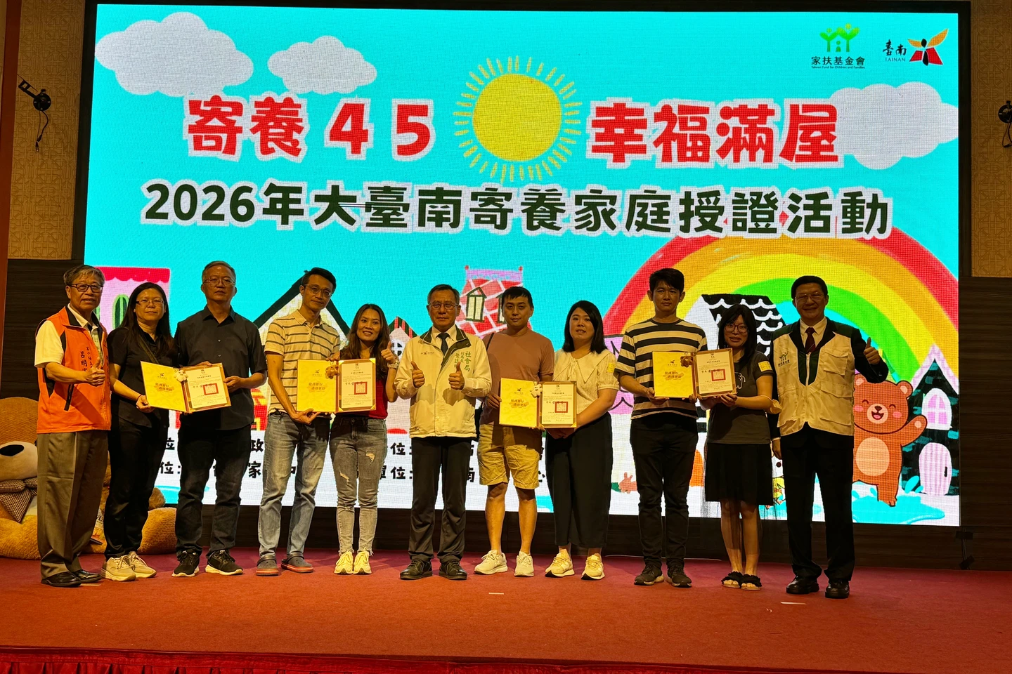 【記者王志弘/台南報導】跨越血緣,為孩子築起溫暖港灣!台南市政府與家扶中心今天盛大舉辦「寄養45‧幸福滿屋」活動,向81戶默默付出的寄養家庭致敬,感謝這群「爸媽」如避風港般守護受難兒少,用愛填補孩子心中的缺口。市府也大聲疾呼,期盼更多家庭挺身而出,讓這份溫暖的善循環持續流動。