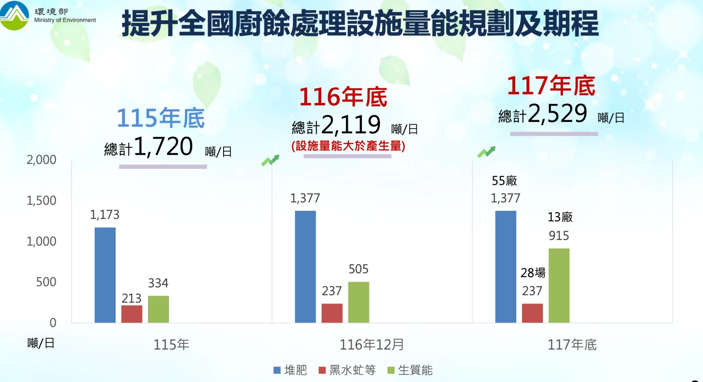但目前全國廚餘處理設施上有缺口,根據環境部評估,以現有的廚餘處理設施量能,在115年底每日總計1,720公噸,對比台灣每日產生2,115噸廚餘,剩餘無法被再利用,只能靠掩埋和焚化。因此環境部未來規劃,將提升堆肥、生質能、養黑水虻廚餘處理設施量能,預估至116年底全部設施量能達每日2,119噸,屆時設施量能大於產生量,廚餘就不用再焚燒處理。