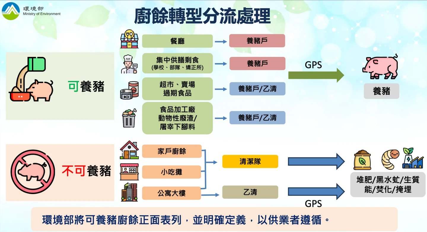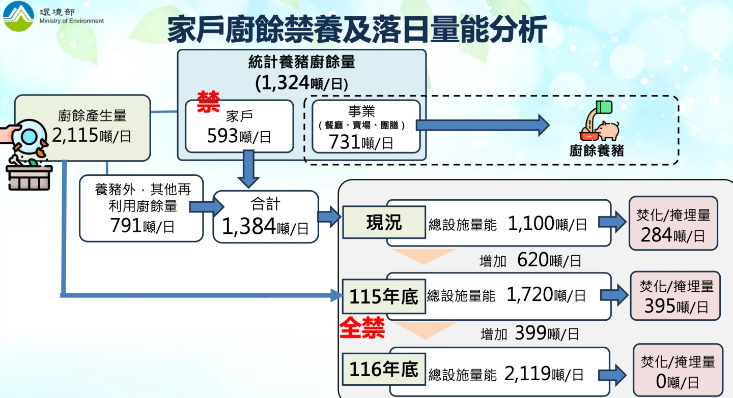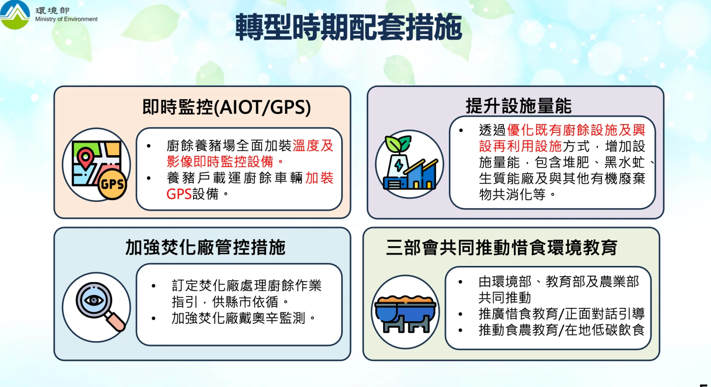 2027年起全面禁止廚餘養豬,代表全國400餘場廚餘養豬場最晚應於115年12月31日前全部轉型為「飼料養豬」。配合未來廚餘養豬政策轉型,環境部規劃4套配套措施,包含已啟動建置養豬場即時監控系統、強化焚化廠管控、提升再利用設施量能及推動惜食環境教育,以強化廚餘再利用管理及去化規劃。