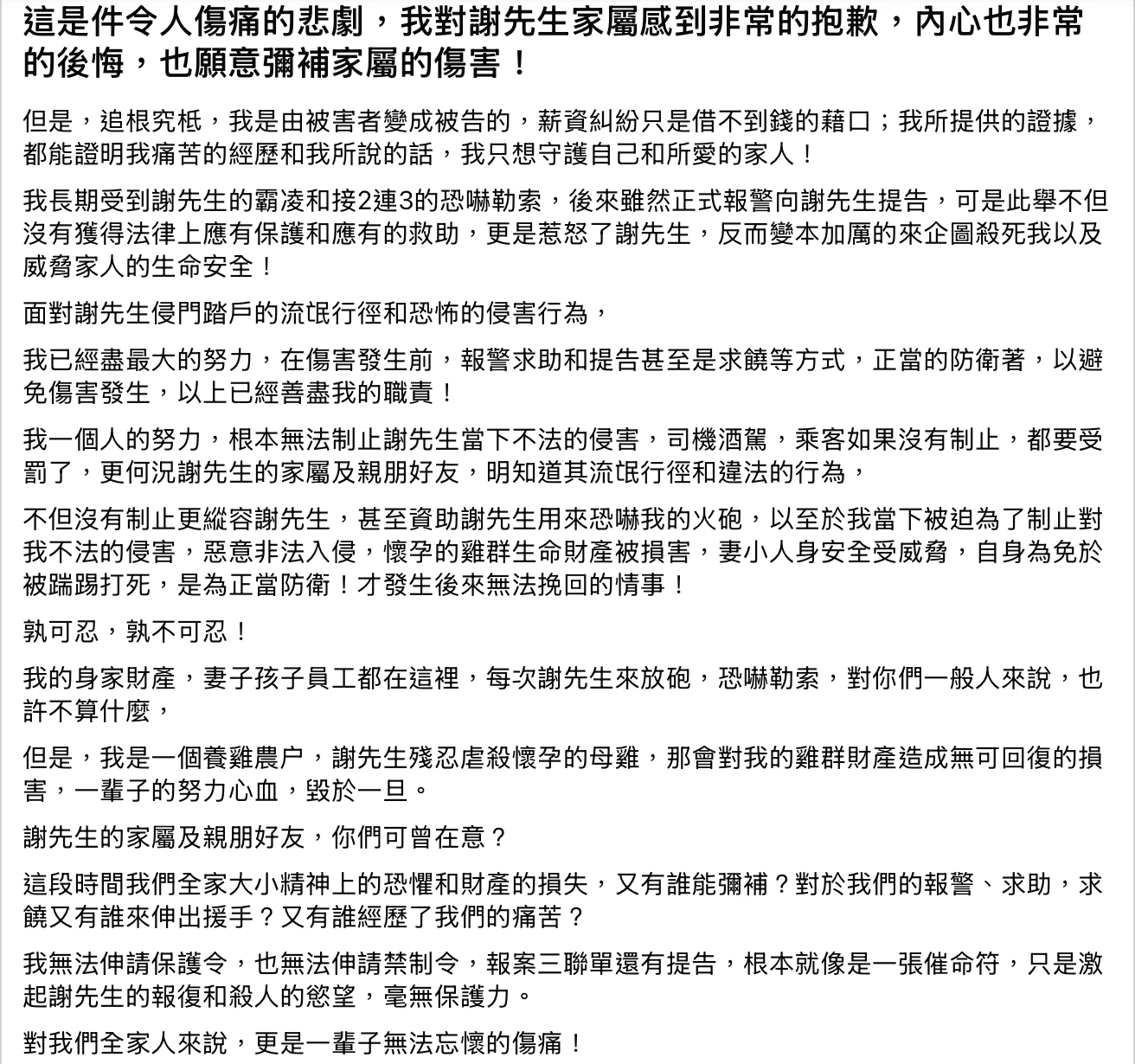 「孰可忍,孰不可忍」林男喊冤表示,事發前努力尋求法律協助,只是事與願違。他強調是正當防衛,才發生後來無法挽回的情事,「我會面對法律的制裁,請大家不要傷害我的家人和孩子!畢竟我們也是受害者」。